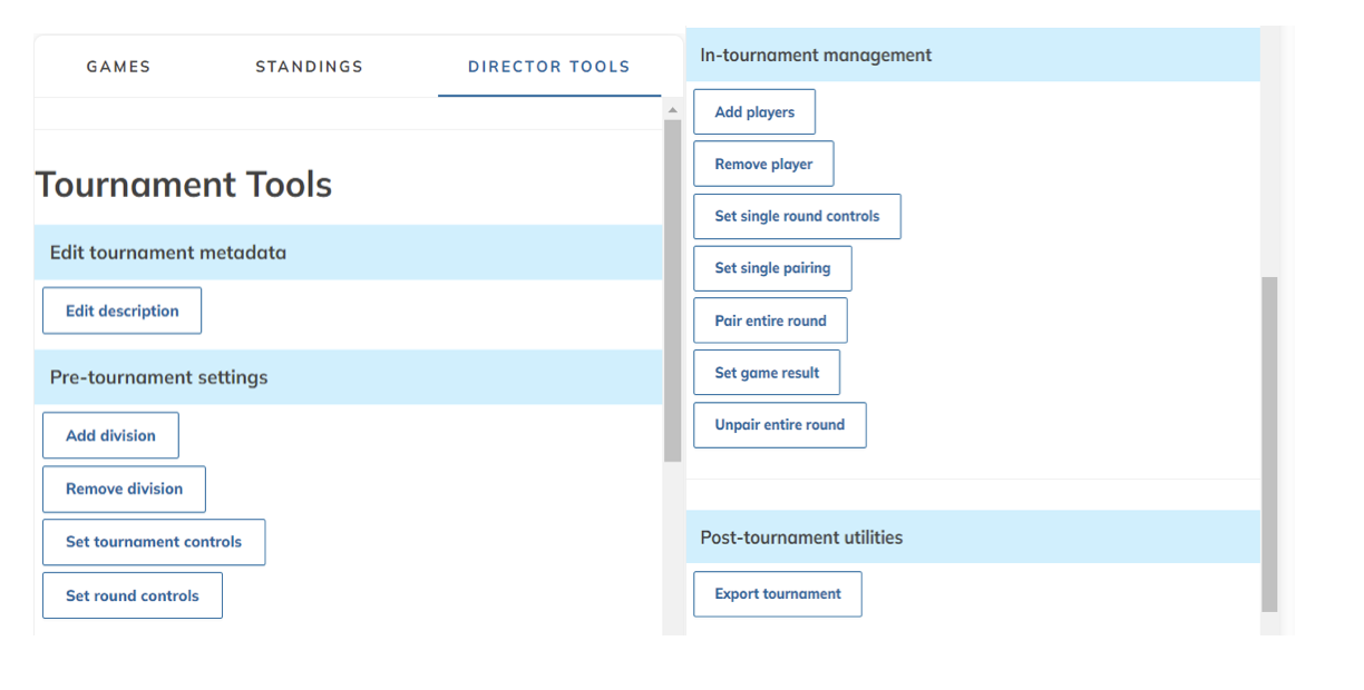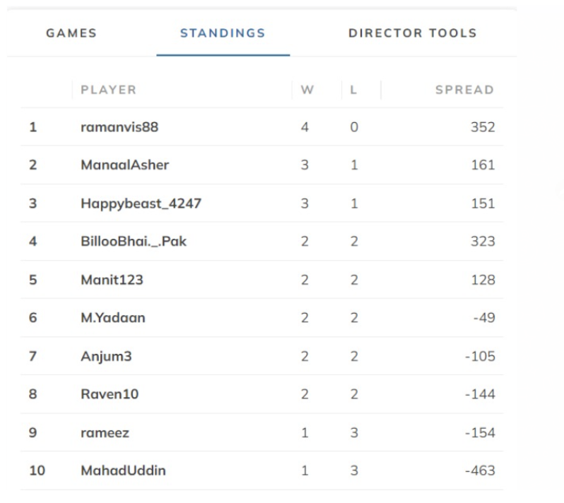 Tournament mode is different from club mode. A player has to obtain a URL link for each tournament every time. The best part of tournament mode is that the pairings and standings are automated & the game spread is also calculated by the system itself, but to make it happen one has to go through the director tools first.