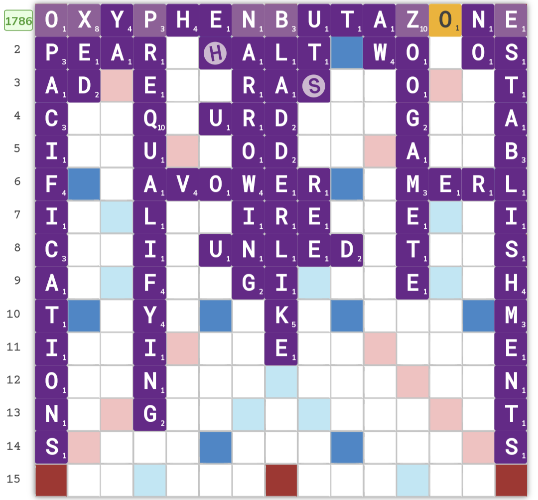 Construction of new 1786-pt OXYPHENBUTAZONE play. Thanks to Discord user ddrkanine for providing the above image (using the Woogles board editor) and verifying it can be played with no phonies.