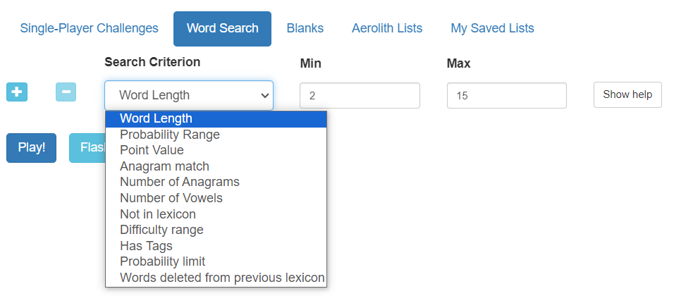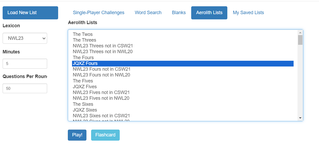 These are Aerolith Customized lists. You may select any list of your choice and you can always change the Minutes and Questions per rounds. You may also change the lexicon by hovering the cursor over to NWL23 and on the dropdown you may select CSW24.