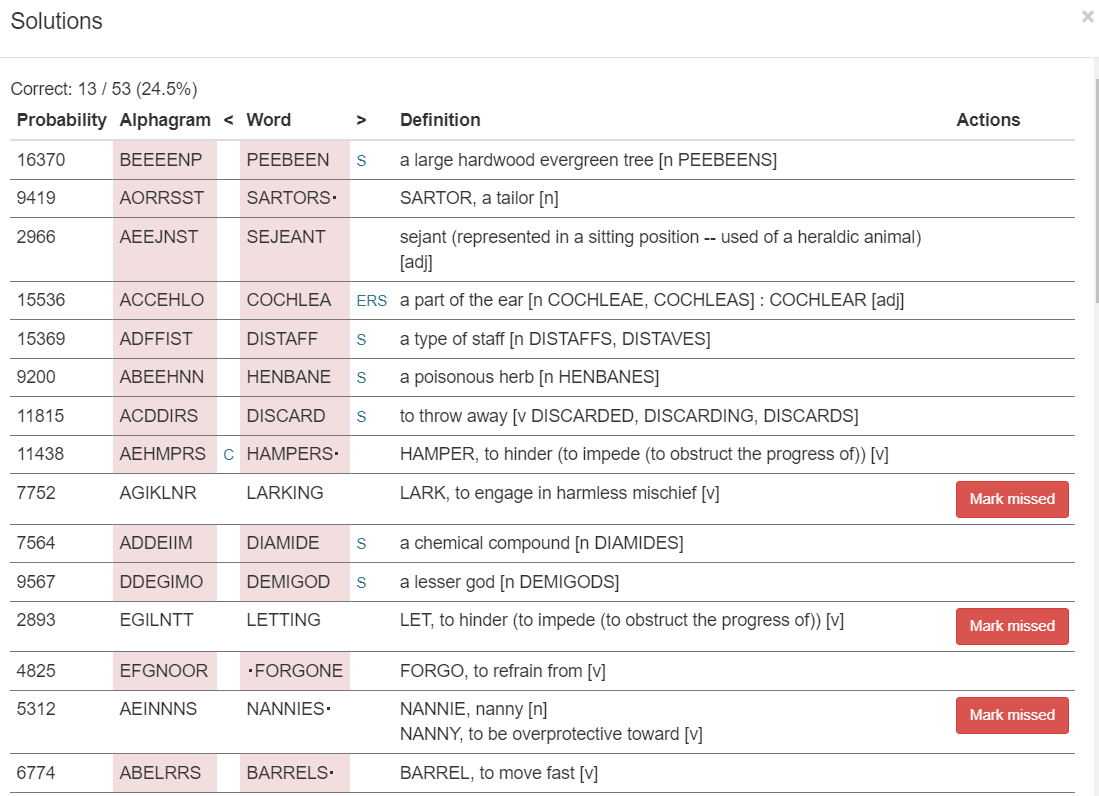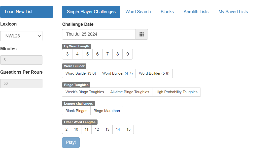 This is one of the favorite features of tournament players that they use on a daily basis. You may select any word length and pick any Challenge data. The minutes and Questions per round can not be changed. It is an exam! Click on Play after making your selection.