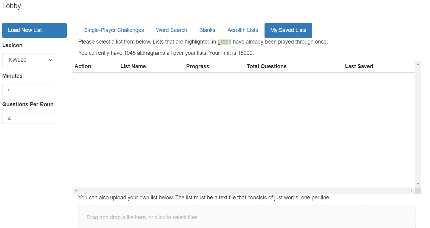 These are Aerolith Customized lists. You may select any list of your choice and you can always change the Minutes and Questions per rounds. You may also change the lexicon by hovering the cursor over to NWL23 and on the dropdown you may select CSW24.