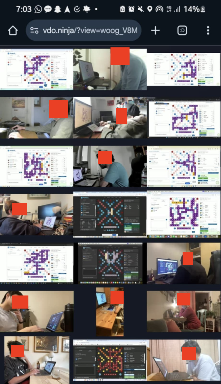 Woogles invigilation mode is powered by vdo.ninja , a fantastic and free piece of software that allows anyone to connect a video stream between two people. We plugged directly into them to allow sharing of screens and camera to be as seamless as possible.